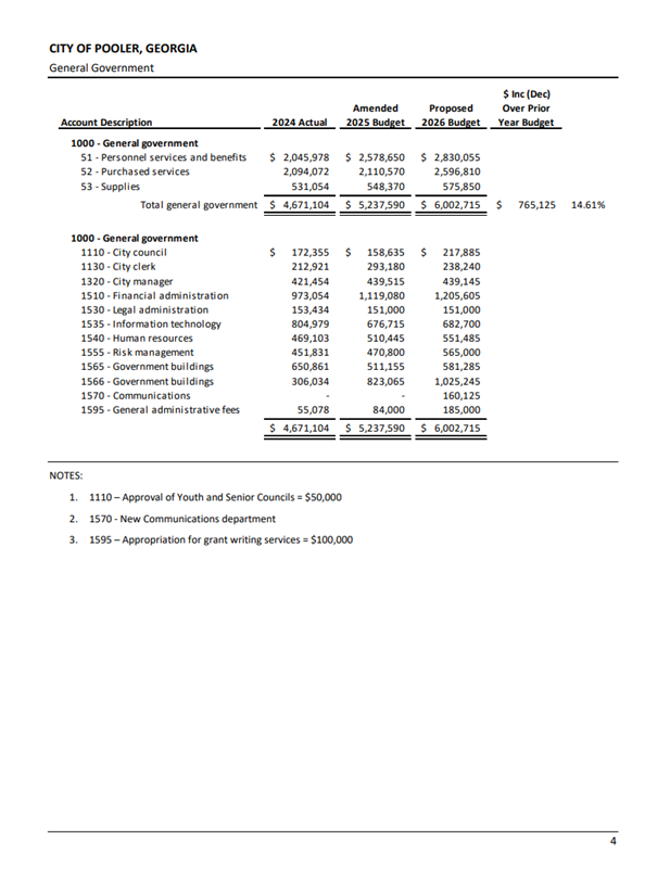 Both hearings will take place at Pooler City Hall, and we invite all interested residents to participate. For the proposed FY2026 Budget and Budget Workshop slides, please visit the links below.