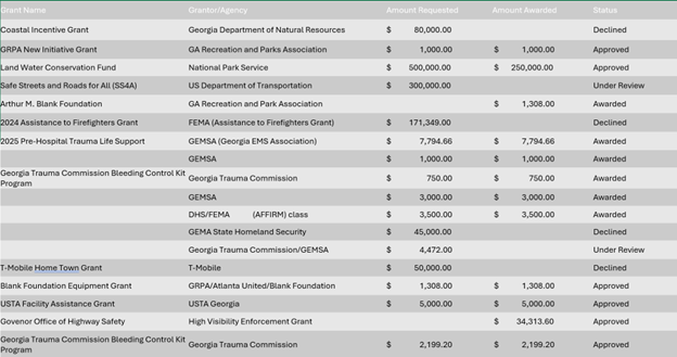 See the status of grants applied for in FY 2025, noting that the City has successfully secured over 60% (12/18) of all grant applications submitted.